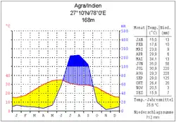 Ágra leží v Indoganžské nížině a její klima je tedy kontinentální, s dlouhým a horkým létem. Od dubna do září dosahují teploty až 45 °C, období dešťů (monzun) nastává v období od července do září. Nejlepší doba k návštěvě města je od října do listopadu nebo od února do března. Prosinci a lednu se je v Ágře lépe vyhnout, především díky husté mlze a také teplotám, které mohou spadnout až k bodu mrazu (velká část domů přitom nemá vytápění).[zdroj?]