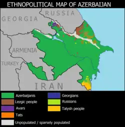 Koncem 19. století se vytvořila ázerbájdžánská národní identita, když Ázerbájdžánská demokratická republika vyhlásila v roce 1918, rok po rozpadu ruského impéria, nezávislost na Zakavkazské demokratické federativní republice a stala se prvním sekulárním demokratickým státem s muslimskou většinou. V roce 1920 byla země dobyta a začleněna do Sovětského svazu jako Ázerbájdžánská sovětská socialistická republika.[10] V srpnu 1991, krátce před rozpadem Sovětského svazu, vyhlásila svou nezávislost moderní Ázerbájdžánská republika.[11][12] V září 1991 etnická arménská většina v oblasti Náhorního Karabachu vytvořila samozvanou Republiku Arcach,[13] která se po skončení první války o Náhorní Karabach v roce 1994 stala de facto nezávislou, ačkoli region a sedm okolních okresů zůstaly mezinárodně uznány jako součást Ázerbájdžánu.[14][15][16][17] Po druhé válce o Náhorní Karabach v roce 2020 se sedm okresů a části Náhorního Karabachu vrátily pod kontrolu Ázerbájdžánu.[18] Ázerbájdžánská ofenzíva v roce 2023 ukončila existenci Republiky Arcach a vedla k útěku Arménů z Náhorního Karabachu.[19]