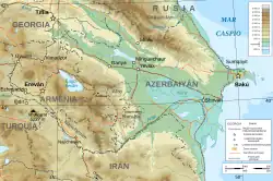 V roce 1988 vznikl ozbrojený konflikt mezi Armény a Ázerbájdžánci o Náhorní Karabach, který v září 1991 vyhlásil nezávislost na Ázerbájdžánu. Přes čtyři rezoluce Rady bezpečnosti OSN zůstalo 20 % ázerbájdžánského území, na němž fungovala tzv. Republika Arcach, pod faktickou arménskou okupací. Během války bylo na obou stranách spácháno mnoho zvěrstev a pogromů, například neblaze proslulý masakr v Chodžaly, kde arménské polovojenské jednotky povraždily 600 ázerbájdžánských civilistů.[58][59] Celkem bylo zabito asi 30 000 lidí a více než milion lidí bylo vysídleno, z toho přes 800 000 Ázerbájdžánců a 300 000 Arménů.[60] (K další eskalaci konfliktu došlo v letech 2016 a 2021).