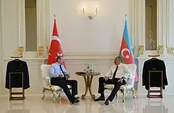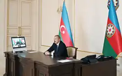 V červenci 2020 byl obnoveny ozbrojené střety v Náhorním Karabachu. Ty se nepodařilo uklidnit a v září vypukla regulérní válka, tzv. druhá válka o Náhorní Karabach. Ázerbájdžánská armáda útočila s podporou Turecka, hlavní velmocenské opory alijevského režimu, Arméni se spoléhali na pomoc putinovského Ruska, která však nepřišla v takové míře, v jakou věřili. Šestitýdenní boje přinesly Ázerbájdžánu územní zisky. Podle mírové smlouvy, podepsané pod Putinovou patronací, si obě strany ponechaly kontrolu nad právě ovládanými územími – Arménie tak sice udržela většinu Náhorního Karabachu, ale Ázerbájdžánu musela odevzdat tři okresy (Kelbadžar, Ağdam a Lačin).[66] Z původních 11 450 km², které byly před válkou pod kontrolou Republiky Arcach, se její území zmenšilo na 3 170 km². Tento výsledek byl v Ázerbájdžánu oslavován jako velké vítězství, naopak v Arménii způsobil nepokoje a krizi.[67] Během bojů padlo 2 783 ázerbájdžánských vojáků a asi 4 000 arménských.[68] V pozemním koridoru mezi Arménií a oblastí Náhorního Karabachu začaly dle mírové smlouvy působit síly ruské armády.[69] To označili pozorovatelé za geopolitické vítězství Ruska, stejně tak ale hovořili o posílení vlivu Turecka v oblasti.[70]