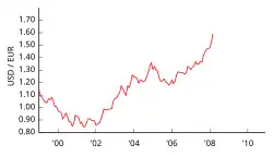 - Od listopadu 2000 do konce září 2007 zpevnilo euro vůči dolaru o 72,5 % – z 0,8252 na 1,4232 USD za 1 €. Americký dolar se od 28. září 2007 dostal pod úroveň kanadského dolaru (poprvé od roku 1976).