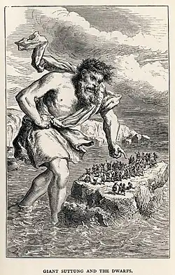 Druhý den ráno navštívili skřítky bohové. Ti tvrdili, že jsou nevinní, a Kvasi se zadusil svojí moudrostí. Bohové jim uvěřili a odnesli si jeho vykrvené tělo. Rychle se roznesla zvěst o básnické medovině mezi osadami. Doneslo se to i k obrovi Gillingovi, kterému byli skřítci dlužni. Tohoto obra vylákali na loďku, která ho neunesla, a obr se utopil. O medovinu se nechtěli s nikým dělit. Přišla za skřítky i obrova manželka a té se také zbavili. Za nějaký čas se skřítci neprobudili v jejich sídle, jak bylo zvykem, ale na dně loďky a s cizím obrem, který o sobě tvrdil, že je syn Gillinga, a jmenoval, se Suttung. Obr se je snažil utopit a v poslední chvilce, aby si zachránili život, mu slíbili všechnu básnickou medovinu. co mají. Obr váhal a na jejich nabídku přistoupil. Skřítkům byl život ponechán a Suttung si odnášel dohromady tři nádoby básnické medoviny. Jak plynul čas, tak skřítci po osadách hlásili, jak s nimi Suttung naložil a tyto zvěsti se donesly až k samotnému Ódinovi. Rozkázal bohům, ať připraví tři dřevěné sudy, nejlepší brousek a nebozez zvaný Rati. Suttung daroval básnickou medovinu své dceři Gunnlöd, která jí střežila v nitru hory.[1][2]
