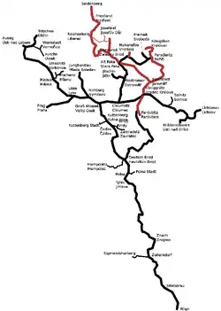 Roku 1873 byla vybudována odbočná trať z Lysé nad Labem na provizorní nádraží na Rohanském ostrově na Karlínském předměstí Prahy, ta byla roku 1875 prodloužena až na Severozápadní nádraží.[17] Dráha tak ve Vídni i v Praze měla hlavová nádraží s výstavními budovami s vysokou architektonickou hodnotou. Paradoxní je, že obě tato nádraží dnes již cestujícím neslouží, a po tom pražském už dnes po jeho odstřelu v roce 1985 nenajdeme prakticky ani stopy.[3]
