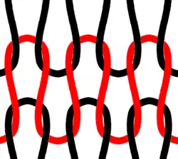 [4] Jestliže jsou kličky propojeny vedle sebe ve směru řádku, vzniká zátažná pletenina (jak je schematicky znázorněno na vedlejším náčrtu). Červená nit vytváří kličky, kterými se provlékají (postupně, vedle sebe) v následujícím řádku černé kličky a tak vzniká řádek z oček.