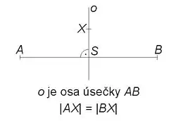Osa úsečky je přímka kolmá k úsečce procházející jejím středem. Všechny body na ose úsečky mají od obou krajních bodů stejnou vzdálenost.