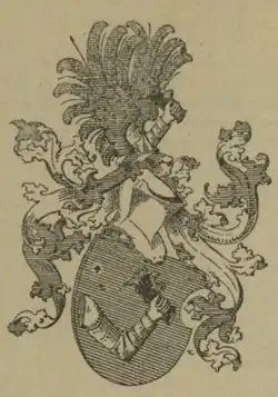 Modrý štít, na něm ruka v brnění. V pěsti drží černý useknutý kohoutí krk, který krvácí.