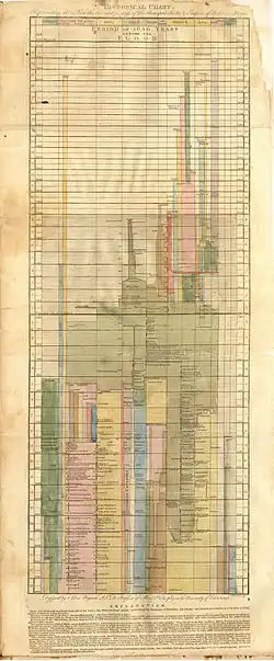 Již v roce 1753 publikoval Jacques Barbeu-Dubourg svoji Carte chronographique, jež byla představována více než 16metrovým pruhem papíru zasazeným do pouzdra, které umožňovalo pomocí madel posouvat časové záznamy. V této „chronografické mapě“ byly zaznamenány události od stvoření světa po autorovu současnost a k vyznačení určitých typů událostí, osobností či jejich povolání byly využity symboly, podobně jako se užívají symboly k vyznačení prvků v zeměpisných mapách.[4] Dalším autorem časových os byl anglický teolog Joseph Priestley, který publikoval v roce 1765 biografickou mapu A Chart of Biography a v roce 1769 A New Chart of History.[4]