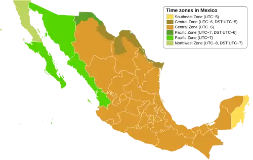 | Zona Centro | centrální zóna | UTC-6 | Campeche, Chiapas, Coahuila, Colima (bez souostroví Revillagigedo), Distrito Federal, Durango, Guanajuato, Guerrero, Hidalgo, Chihuahua, Jalisco, México, Michoacán, Morelos, Nayarit (pouze Bahía de Banderas), Nuevo León, Oaxaca, Puebla, Querétaro, San Luis Potosí, Tabasco, Tamaulipas, Veracruz, Yucatán, Zacatecas |