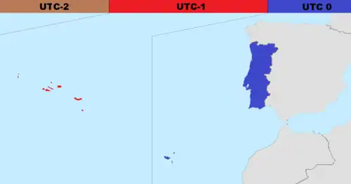 Zákonem 17/96 z roku 1996 je zákonný čas ve Portugalsku definován ve vztahu k UTC jako UTC 0 v létě a UTC+1 v zimě.[1] Autonomní oblasti Portugalska mají dle ústavy kompetenci si ve vztahu k UTC stanovit vlastní čas. V souladu tím platí na Madeiře čas stejný jako na kontinentální části (UTC 0)[2] a na Azorách čas o jednu hodinu posunutý (UTC-1).[3]