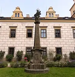 Vlevo od hlavního vchodu do zámku stojí pískovcový pilíř ve tvaru obelisku se sochou Panny Marie s Ježíškem. Pilíř je zdoben barokním páskovým ornamentem. Na soklu neseném čtyřmi volutami má dva latinské nápisy s dedikací a chronogramem vzniku 1744. Na jeho přední straně je vytesána dvojice plastických kartuší s aliančními erby objednavatelů pod hraběcí korunkou, a to Františka Filipa hraběte ze Šternberka a jeho manželky Marie Leopoldiny, rozené hraběnky ze Starhembergu. Podle farních záznamů stála socha původně na rozcestí naproti městskému špitálu. V roce 1901 dala vdova Marie Sýkorová celou sochu pozlatit. V roce 1955 statue z důvodů rozšíření komunikace překážela dopravě, byla rozebrána a traktor s vlekem ji převezl na nynější místo.[3]