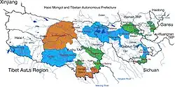 | 6 | Chuang-nan (tibetský) | 黄南藏族自治州 | Huángnán Zàngzú Zìzhìzhōu | Malho | རྨ་ལྷོ་བོད་རིགས་རང་སྐྱོང་ཁུལ་ | rma-lho bod-rigs rang-skyong-khul |