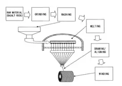 Výrobní technologie se zakládá na tavném zvlákňování při teplotě 1500-1700 °C. Při dostatečně rychlém zchlazení vzniká sklovitá hmota, při pomalejším chlazení se tvoří krystaly ze směsi minerálů. Pro některé účely se vláknina dlouží při teplotě cca 1300 °C.[2] Zvlákňovací trysky mohou mít několik set otvorů, odváděcí rychlost dosahuje až 2000 m/min.