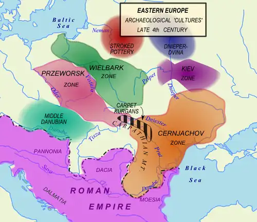 Černjachovská kultura byla archeologická kultura rozšířená od 2. do 5. století na dnešní Ukrajině, částečně i v Rumunsku. Typická jsou neopevněná sídliště na jižních svazích u řek. Nad nimi pak birituální pohřebiště s popelem v popelnicích či jamkách, převažují však kostrové hroby. Často jsou mrtví uložení do výklenku v hrobové jámě. Pohřbívalo se také v kamenných sklepeních uzavřených kamennou deskou, což prozrazuje skytský a sarmatský vliv. Keramika byla tvořena na hrnčířském kruhu a inspirována keltskou a antickou. Nezdobená keramika dělaná ručně se podobá raně slovanské. Živili se zemědělstvím, vysokou úroveň mělo i řemeslo. Typické jsou spony ve tvaru samostřílu, vycházející z římských vzorů.