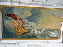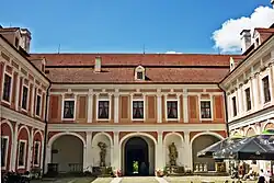 Přízemní[15] místností má stropy zaklenuté valenou klenbou nebo valenou klenbou s výsečemi.[22] Významným prostorem, který zabírá dvě poschodí, je velký sál v rizalitu hlavního průčelí. Vstup do něj umožňují čtyři portály se štukovou výzdobou. Horní část stěn sálu je zdobená pilastry podepřenými štukovými atlanty a výklenky s mytologickými postavami. Pod nimi jsou malby bitevních scén a štukové reliéfy. Mytologické a lovecké výjevy jsou také na stropě s vysokým fabionem.[15] Z roku 1695 pochází zámecká kaple svatého Jana Křtitele rozšířená roku 1787.[22] V jejím presbytáři byla použita necková klenba, zatímco loď má klenbu valenou s lunetami.[15]