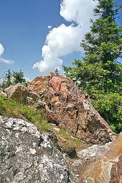 Červený kámen je nejvýraznější kvarcitový výchoz na jz. svahu Ještědu o délce cca 250 m. Plochy puklin na zdejší skále jsou pokryty vrstvami červených oxidů železa – odtud název Červený kámen. Z vrcholové skály se nabízí překrásný pohled na vrchol Ještědu i krajinu Podještědí.[1]