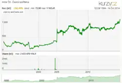 - ↑ Akcie ČESKÁ SPOŘITELNA – Vývoj ceny na Burze Praha a historické statistické obchodování