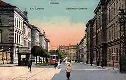 V Českých Budějovicích, zvláště v 2. polovině 19. století a ve 20. století, bývala silná vojenská posádka.[25][26] Upomínkou jsou například Mariánská kasárna nebo Žižkova kasárna.
