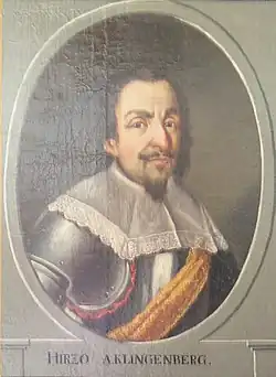 Během třicátých let 17. století se díky bojům třicetileté války ve středních a severních Čechách staly Budějovice dočasně, na 22 měsíců, hlavním městem, do kterého se přesunuly některé důležité úřady z Prahy. Byly tu uložené i korunovační klenoty.[16] Svatováclavská koruna byla skryta v kostele sv. Mikuláše, kde ji střežili Valdštejnovi vojáci a ozbrojení měšťané. Znovu byly klenoty ve městě ukryty, před Švédy, v letech 1634–1635.