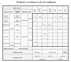 Čeština má celkem 27 souhláskových fonémů, které se tradičně rozdělují podle způsobu a místa tvoření. U tzv. pravých souhlásek navíc existují dvojice lišící se svojí znělostí.