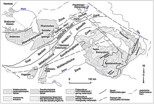 - ↑ a b c d Kachlík, V., 2003: Geologický vývoj území České republiky. Doplněk k publikaci „Příprava hlubinného úložiště radioaktivního odpadu a vyhořelého jaderného paliva“[nedostupný zdroj] SURAO, Praha, 54 s.