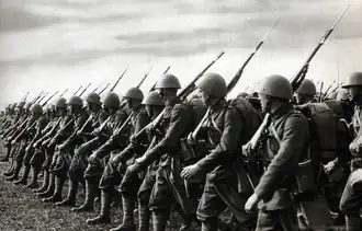 V roce 1935 uzavřelo Československo se Sovětským svazem spojeneckou smlouvu o vzájemné pomoci v případě německého útoku.[14] Reorganizace čs. armády byla ukončena v roce 1938. V míru se skládala ze 7 velitelství sborů, 17 pěších divizí a 4 rychlých divizí, přičemž její početní stav činil 200 000 mužů, z čehož 74,4 % bylo české, slovenské nebo jiné slovanské národnosti, 19,4 % Němců, zbytek tvořili Maďaři a ostatní.[15] Mobilizační plán z roku 1936 počítal v případě vyhlášení mobilizace s povoláním 972 747 mužů. Z nich mělo být 718 230 slovanského, 192 844 německého a 61 671 maďarského původu. Podíl Slováků mezi důstojníky činil 3,6 až 5 %.[16]