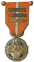 Masivní bronzová medaile zavěšená na prstenci z lipových ratolestí, skrz který prochází stuha. Stuha je červená, 38–41 mm široká s bílým pruhem uprostřed. Tento bílý pruh je lemován modrým proužkem. Samotný odznak má zdobení na obou stranách. Je tvořen rovnoramenným řeckým křížem. Na lícové straně je vyveden jezdec na koni s vlajkou v pravé ruce. Na této straně je i nápis Vzhůru na stráž svobodný národe. Rubové straně dominuje okřídlená žena a datum 1914–1918.