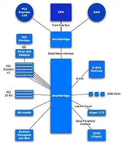 Typické zapojení čipové sady na základní desce osobního počítače PC.