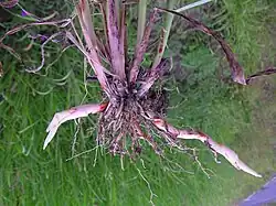 Vytrvalá travina s četnými, světle zelenými stébly s načervenalým nádechem, která bývají vysoká 50 až 150 cm (ojediněle až 270 cm) a u báze mívají průměru 1 až 2 cm. Stébla vyrůstají v trsech z plazivých bílých, až 1 cm tlustých a 2 m dlouhých, sympodiálně větvených, víceletých podzemních oddenků sahajících do hloubky až 1 m; hlavní kořen rostlina postrádá. Stébla jsou pevná, přímá, hladká a mají průměrně sedm chlupatých kolének.
