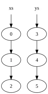 Položky v seznamu xs byly zkopírovány, ale položky seznamu ys jsou sdíleny. Ve výsledku původní seznamy (xs a ys) přetrvávají a jsou nezměněny. Důvod ke kopírování je ten, že poslední položka v xs (která původně obsahuje dvojku) nemůže být změněna tak aby ukazovala na začátek ys, protože by to změnilo hodnotu xs.