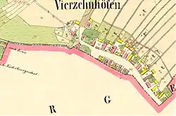 ![]() Osada Čtrnáct Dvorců (Vierzehnhöfen) mezi Horním a Dolním Jiřetínem na mapě z 19. století | |
