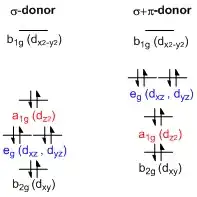 Diagram štěpení d-orbitalů u čtvercově rovinných (D4h) komplexů přechodných kovů lze odvodit z obdobného diagramu pro oktaedrické komplexy, v nichž jsou orbitaly dz2 a dx2−y2 degenerované a mají vyšší energie než seskupení degenerovaných orbitalů dxy, dxz a dyz. Při odejmutí dvou axiálních ligandů a vytvoření čtvercově rovinné geometrie se energie orbitalu dz2 orbital sníží v důsledku odstranění vzájemného odpuzování elektronů na ligandech na ose z; u čistě σ-donorových ligandů má ale orbital dz2stále vyšší energii než dxy, dxz a dyz. Elektronová hustota je u něj rozprostřena na osách x a y, takže tento orbital interaguje se zaplněnými orbitaly. Orbitaly dxy, dxz a dyz se obvykle popisují jako degenerované, ale štěpí se do dvou různých energetických úrovní. Jejich uspořádání zavisí na vlastnostech každého komplexu. Štěpení orbitalů d narušují, na rozdíl od oktaedrických komplexů, π-donorové ligandy. Silné π-donory mohou způsobit, že energie orbitalů dxz a dyz jsou vyšší než u dz2, zatímco u oktaedrických π-donory ovlivňují pouze míru štěpení a vzájemné uspořádání orbitalů se zachovává.[1]