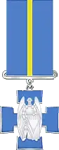Stuha z hedvábného moaré pokrývá kovovou obdélnou destičku. Šířka stuhy je 28 mm. Stuha je modrá se žlutým proužkem širokým 3 mm uprostřed. Řád se nosí nalevo na hrudi.
