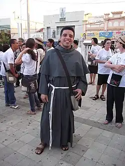 Řeholní oděv: černý hábit s kapucí, provazovým cingulem s růžencem, kněží mají kolárek a černý biret.