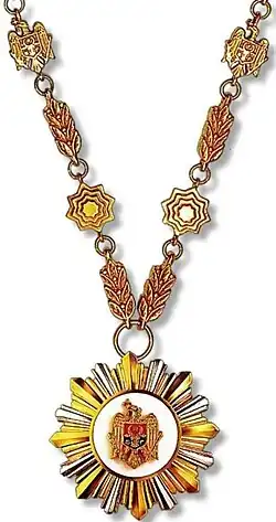 Řádový odznak má tvar pozlacené stříbrné osmicípé hvězdy. Uprostřed je kulatý bíle smaltovaný medailon s vyobrazením státního znaku Moldavska. Státní znak je zlatý se štítem pokrytým červeným a modrým smaltem. Průměr odznaku je 45 mm. K řádovému řetězu je připojen jednoduchým kroužkem.o průměru 10 mm Řetěz se skládá ze šesti článků ve tvaru státního znaku, osmi článků ve tvaru hvězdy a 16 článků ve tvaru vavřínových větviček. Jednotlivé články jsou mezi sebou spojeny kroužky. Délka řetězu je 80 cm.[1][2]