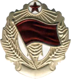 Řádový odznak oválného tvaru je vyroben ze stříbra nebo tombaku. Odznak je vysoký 42 mm a široký 38 mm. Uprostřed je rudý prapor umístěný na bíle smaltovaném pozadí orámovaném věncem z pšeničných klasů. V horní části je červeně smaltované pěticípá hvězda umístěná na kruhovém, bíle smaltovaném pozadí. Na přední straně jsou kovové části pozlacené. Na zadní straně je vyraženo číslo vyznamenání. Odznak je ke stuze připojen pomocí jednoduchého očka.[1]