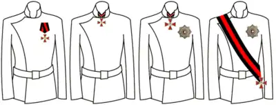 - II. třída: odznak zavěšený na stuze u krku a hvězda na pravé straně hrudi