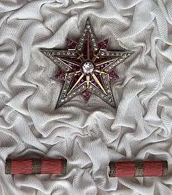 Řádový odznak o průměru 68 mm měl tvar zlaté pěticípé hvězdy po obvodu osázené diamanty v jejímž středu byla menší hvězda s cípy osázenými rubíny. Uprostřed odznaku byl větší diamant o průměru 6 mm, který byl umístěn ve středu křížení pěti zlatých mečů. Mezi většími cípy hvězdy byly menší paprsky osázené rubíny. Odznak byl vyroben ze zlata a platiny a byl osázen celkem 61 diamanty a 45 rubíny.[3]