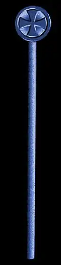 ![]() Červený rovnoramenný kříž s rozšířenými konci a černo-bílý prapor byly obecnými znaky řádu. | |
