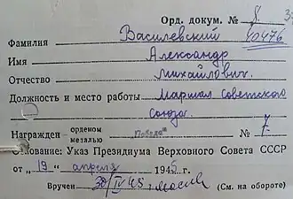 - ↑ Указ Президиума Верховного Совета СССР от 8 ноября 1943 г. «Об учреждении ордена „Победа“» (Ведомости Верховного Совета СССР, 1943 г., № 48)