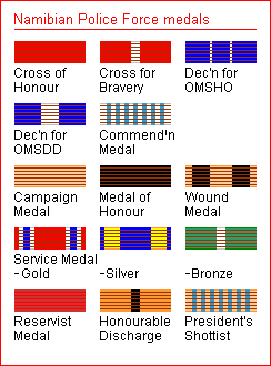- Čestný kříž Policie Namibie (CH) je udílen za velmi výjimečný čin v život ohrožující situaci vyžadující značné hrdinství. Stuha je červená.
