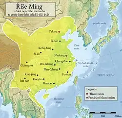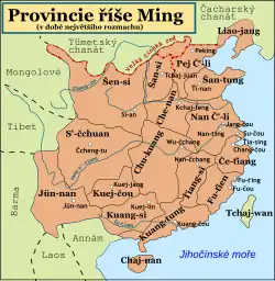 Říše Ming (čínsky: znaky tradiční 明國, zjednodušené 明国, pinyin Míng Guó, český přepis Ming Kuo), plným názvem Říše Velká Ming (čínsky: znaky zjednodušené 大明国, tradiční 大明國, pinyin Dà Míng Guó, český přepis Ta Ming Kuo; také anachronicky čínsky: znaky zjednodušené 大明帝国, tradiční 大明帝國, pinyin Dà Míng Dìguó, český přepis Ta Ming Tikuo) byl čínský stát nazvaný podle vládnoucí dynastie Ming (čínsky: znaky 明朝, pinyin Míng Cháo, český přepis Ming Čchao). Říše byla založena roku 1368 vyhnáním mongolské dynastie Jüan. Bývá považována za „jedno z největších období řádné vlády a sociální stability v historii lidstva,“[2] kdy čínská civilizace měla vysokou úroveň a začínala vytvářet kapitalismus.[3] Mingové byli poslední čínskou národní (tj. chanskou) dynastií, vládnoucí Číně po tři století. Následovala je mandžuská dynastie Čching.