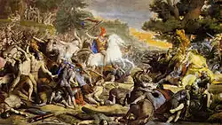 O vojenském tažení z roku 9 se nedochovalo mnoho informací až do doby návratu Varových legií z tábora na řece Vezera zpět do zimoviště v Castra Vetera. Na cestě do zimoviště obdržel Varus od Arminia zprávu o tom, že západně od římského tábora došlo k malému povstání. Pro Římany bylo potlačení vzpoury jen malou zajížďkou a tak ustoupili z hlavní komunikace a vydali k místu, které Arminius označil místem vzpoury. Ve skutečnosti to byla léčka, během níž Arminius plánoval zničení římských legií. Bitva v Teutoburském lese se udála v době panonského povstání, kdy byla většina římských legií dislokována v Ilýrii a tak Varus měl v Germánii pouze tři legie.[27] Když se legie přiblížily ke Kalkriese, musely projít hlubokým lesem s úzkou komunikací a tak postupovaly v těsné formaci, která se natáhla do několika kilometrové délky. V lese pak bylo germánskými kmeny napadeno čelo formace. Římané nezvyklí této vojenské taktiky[28] se v bahnitém terénu, který jim ztěžoval pohyb nedokázali bránit.[29] Varus neměl přehled o situaci, protože komunikaci ztěžovala délka formace natěsnaná na úzké cestě a tak nařídil vojákům, aby postoupily vpřed, ale z lesa útočila koalice germánských kmenů v obrovském počtu válečníků. Překvapení Římané ve střední a zadní části formace začali utíkat všemi směry, ale většina z nich padla nebo utonula v bažinách.[6] Varus si uvědomil závažnost své situace a tak se zabil nalehnutím na svůj meč. Několik Římanů přežilo jen proto, že zůstali skryti a opatrně postupovali lesy zpět do zimoviště v Castra Vetera.[30]