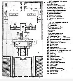 V příkopech se zeminou a křídou byly pěstovány rostliny jako růže, kvetoucí stromy, živé ploty, rozmarýny, lilie a yzop. Ve východní části zahrady byly treláže, pravděpodobně pro popínavé rostliny, například růže. Systém vodního potrubí v podzemí naznačuje, že kašny byly umístěny v pravidelných odstupech podél cest. Zahrada byla doplněna klasickými mramorovými a bronzovými sochami v římském stylu. [4] Z výzkumů tedy vyplývá nejen důkladně plánovaná estetika celého díla, ale i hlubší znalosti zhotovitele o zemědělství.