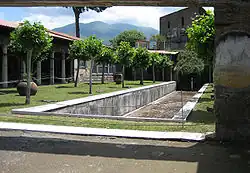 Některé vzory městských zahrad Římanů ze začátku našeho letopočtu, je možné získat z obrazů zachráněných z trosek Herculanea a Pompejí, jež byly pohřbeny pod proudy lávy z Vesuvu roku 79 n. l. Zahrady na obrazech zde jsou reprezentovány jako malé plochy pozemků před domy, uzavřené mřížovím, osázené živými ploty a ozdobené vodotrysky, vázami a jinými ozdobami. Rostliny v květináčích se objevují někdy na chodnících a postavené v oknech. Na dveřích může být někdy zpozorována popínavá rostlina. Stěny, které obklopují dvory, lze vidět v Pompejích, ale největší zahrada nemá více než čtvrt akru.[L 1]