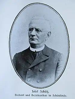 - 1887 Josef Schütz, n. 5. 4. 1839 Schönfeld., o. 30. 6. 1864,[3] † 8. 12. 1918,[4] děkan a okrskový vikář