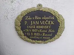 - 1874–1883 R.D. Jan Vlček, farář (26. dubna 1807 Kutná Hora – 13. března 1883 Ronov nad Doubravou)