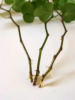 Kořenovými řízky lze snadno množit některé odnožující druhy růží[8] a popínavé rostliny, jako například podražec .