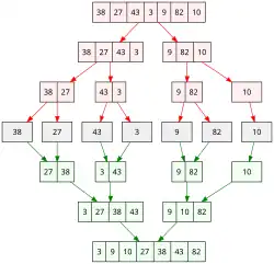 Řazení slučováním[1], známé také pod anglickým názvem merge sort, je řadicí algoritmus, jehož průměrná i nejhorší možná časová složitost je (O(N log N)). Algoritmus je velmi dobrým příkladem programátorské metody rozděl a panuj.