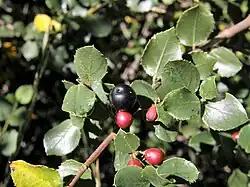 Středomořský druh řešetlák proměnlivý (Rhamnus alaternus) – listy a plody