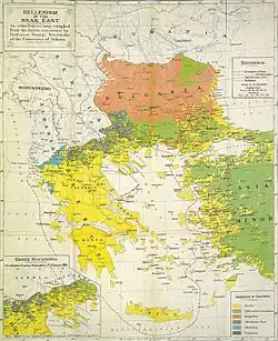 Řecké jazykové skupiny v Turecku v roce 1910, žlutě spisovná řečtina, oranžově pontská řečtina, zeleně kappadocká řečtina